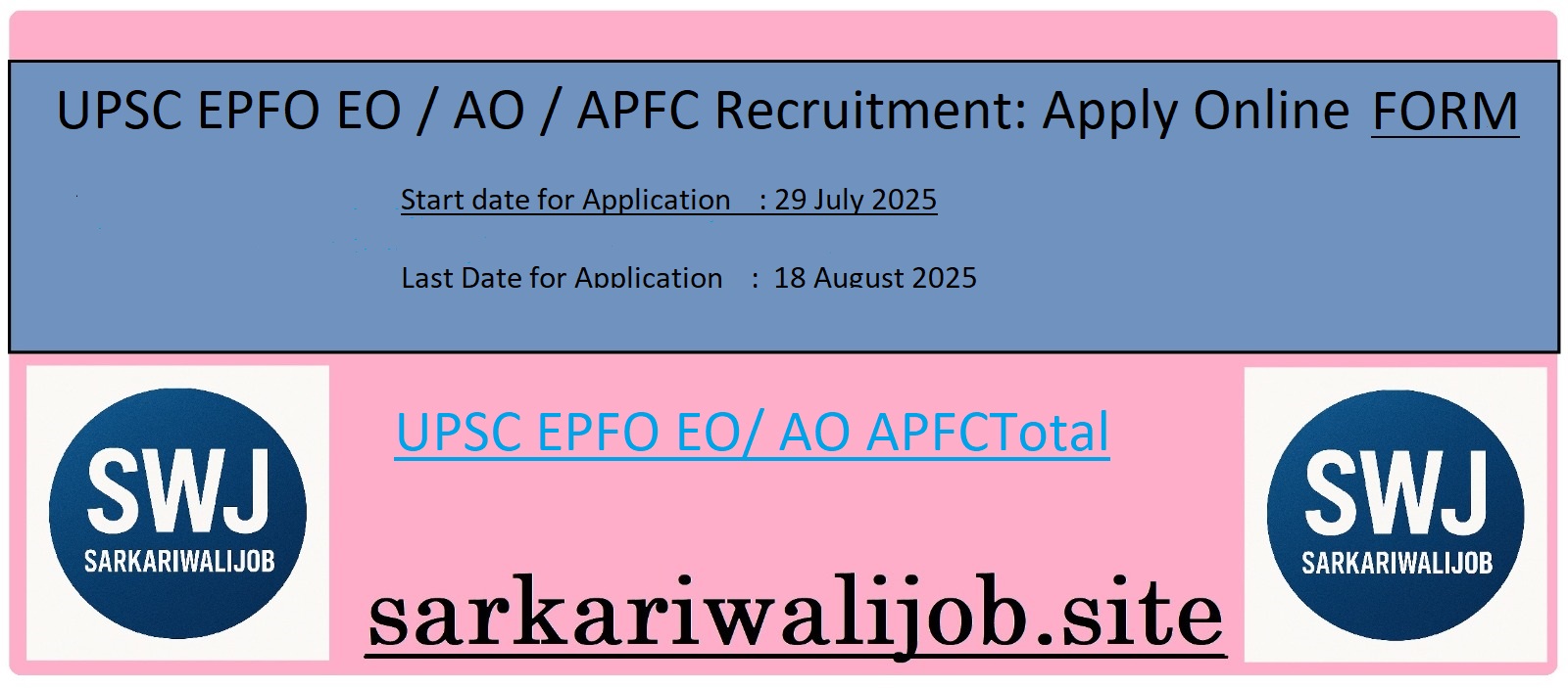 | Short details about the exam : | UPSC EPFO Recruitment Online Form 2025: on its official website. The application process started on 29 July 2025 and will continue until 18 August 2025 . The date for the entrance examination has not been announced yet. Candidates are advised to regularly check the official website for the latest updates regarding theUPSC EPFO EO / AO / APFC Recruitment 2025. Key details are given below. SarkariWaliJob.site |